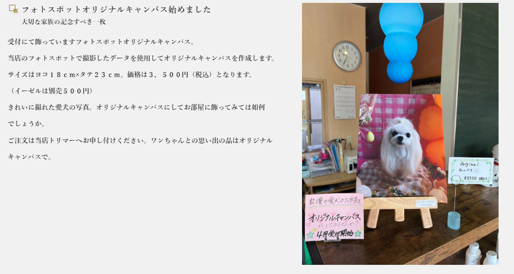 ※定休日のお預け及びお迎え時間につきまして9時から9時30分、16時から17時とさせていただいています。